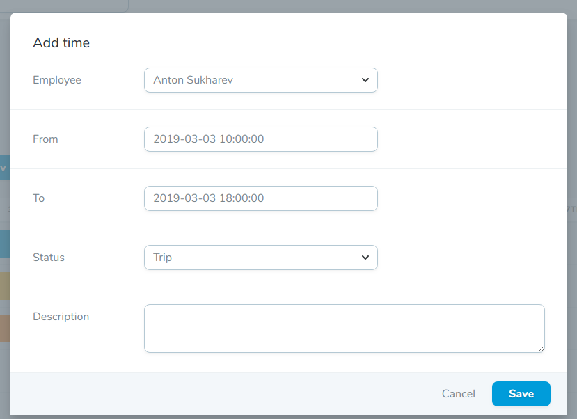В данный момент при выборе ячейки по умолчанию выставляется период отсутствия на 1 день Более детальное заполнение доступно в разделе Time management (в том числе и не отсутствия)