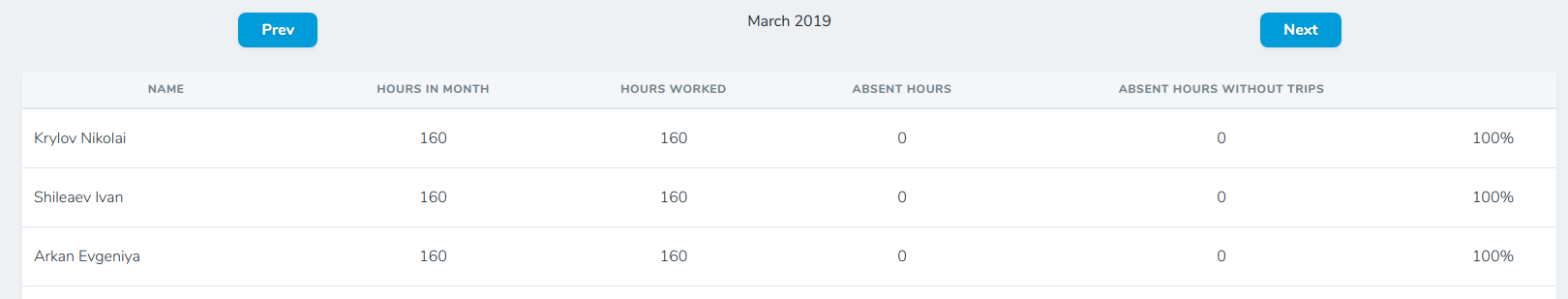 - В последней колонке указан процент выработанных часов с учётом отсутствий