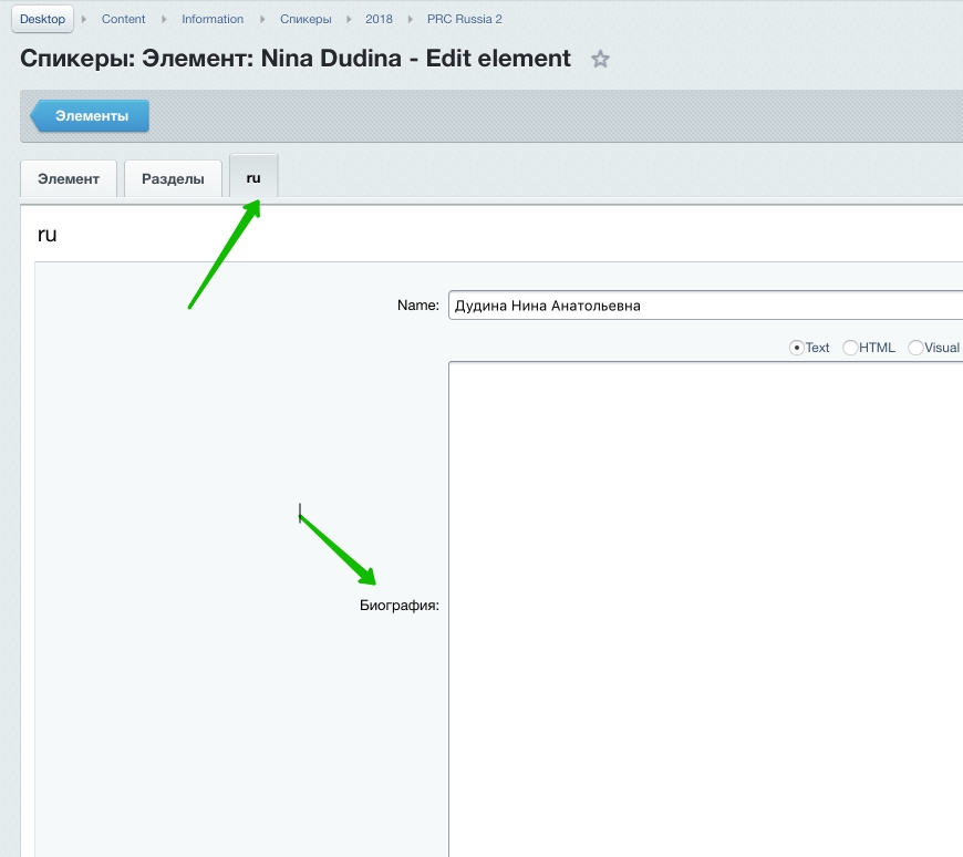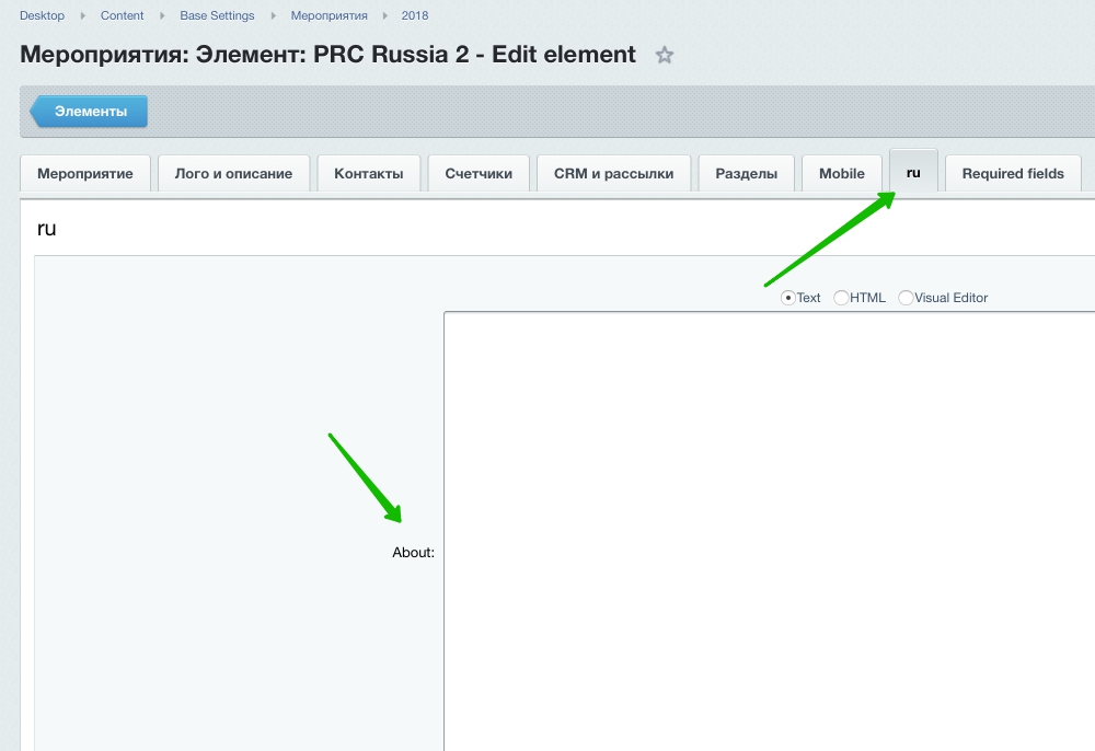 Для многоязычных мероприятий также необходимо заполнить данное поле на соответствующей вкладке: