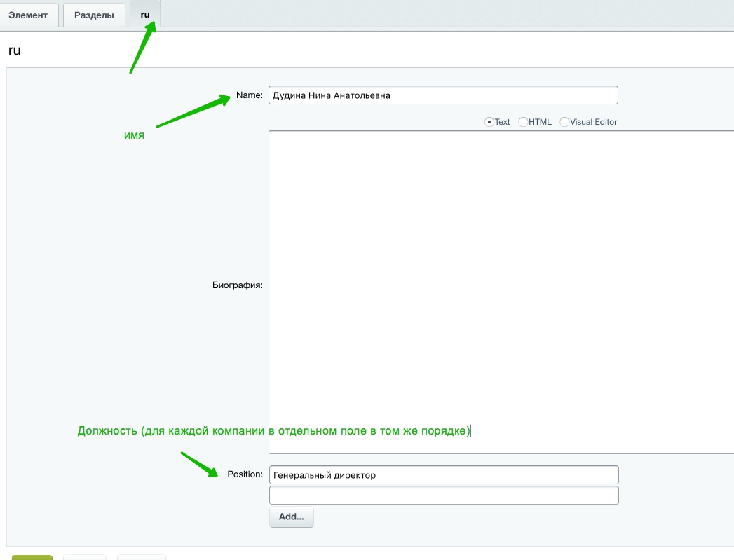 Для многоязычных мероприятий также необходимо заполнить имя и должность на соответствующей вкладке: