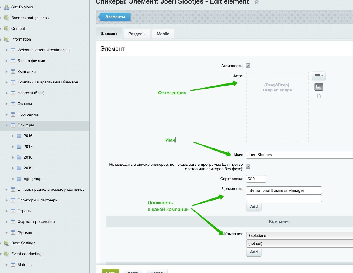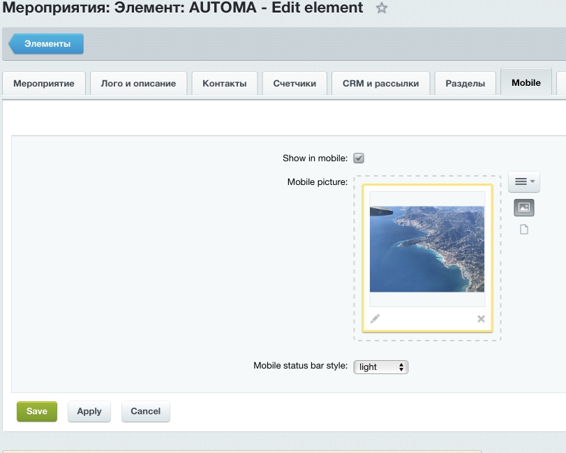 У каждого элемента данного инфоблока есть вкладка Mobile, содержащая необходимые поля для отображения мероприятия в мобильном приложении. Данные настройки влияют на отображение мероприятия как в списке, так и в карточке