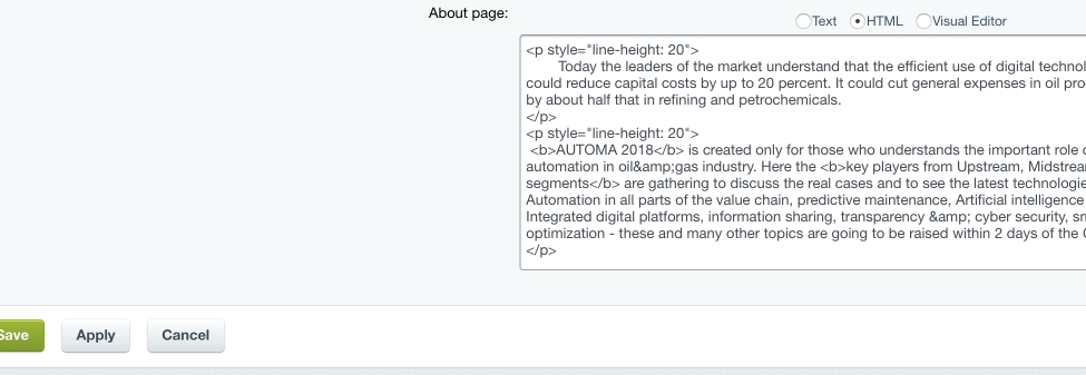 В админке в этом поле можно вставлять как текст, так и html (можно использовать визуальный редактор)