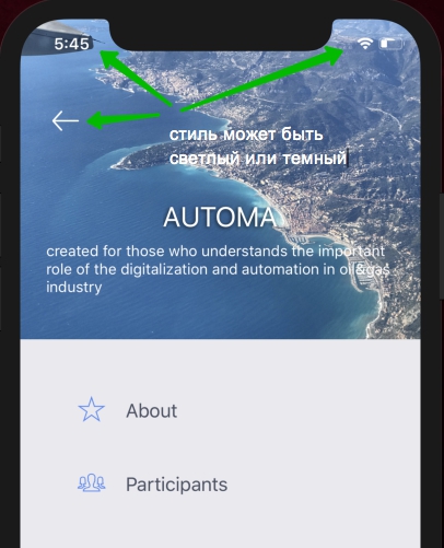 Стиль status bar, если нужно чтобы иконки были светлыми или темными (если фоновая картинка темная, указывать light, иначе dark)
