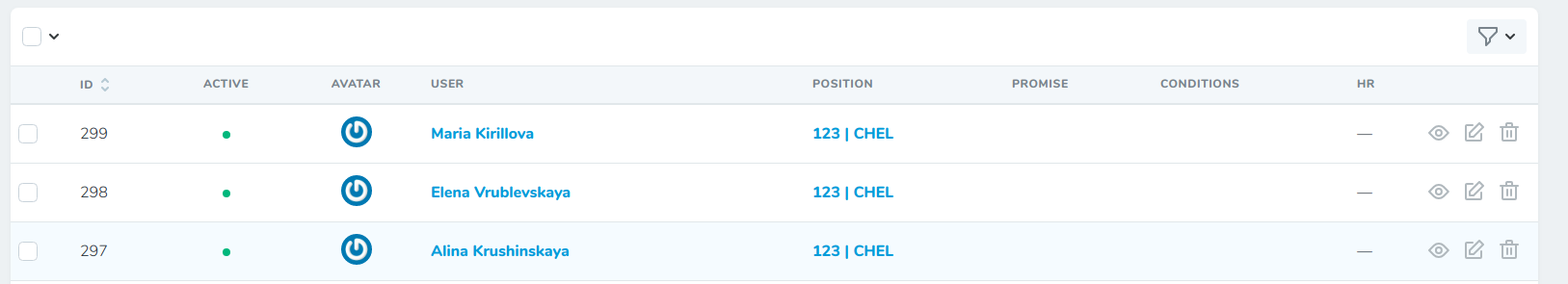 Сотрудники, нанятые этим HR (заполняется в действиях над сотрудником). В том случае, если сотрудник является HR