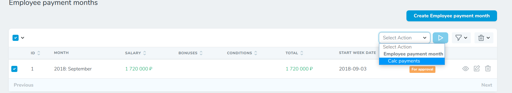 Действия в списке зарплатных месяцев расположены в правом верхнем углу: