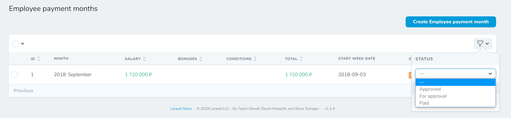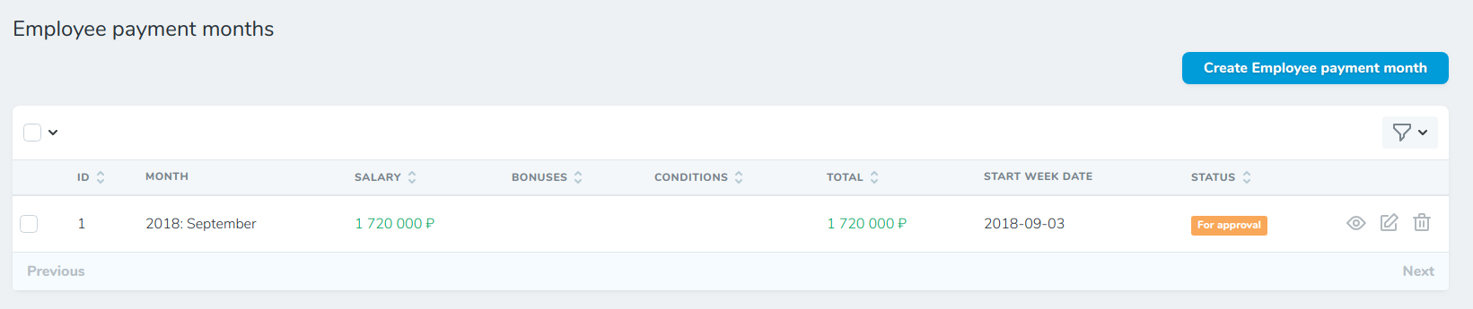 - Statuses (for approve - не согласован / approved - согласован / paid - выплата произведена)
