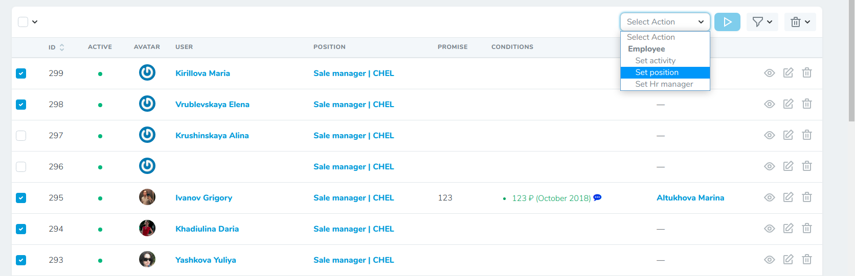 - Выбрать сотрудников в списке