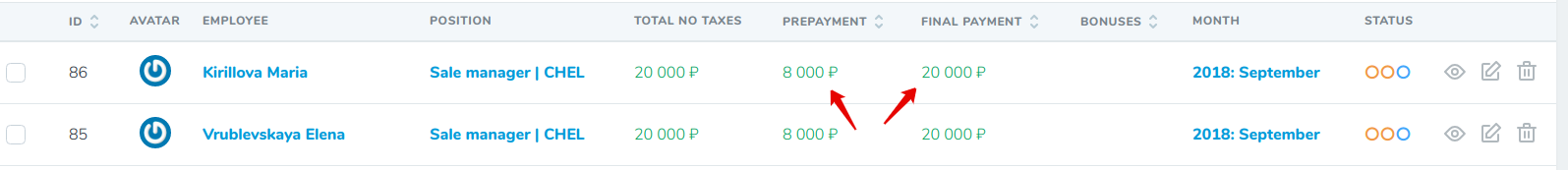 - Оклад всегда показан в виде "Предоплаты" и "Общей суммы оклада"