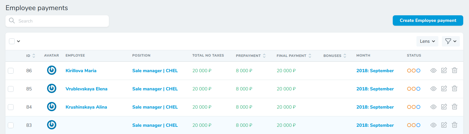Действия в списке зарплатных месяцев расположены в правом верхнем углу: