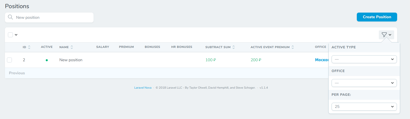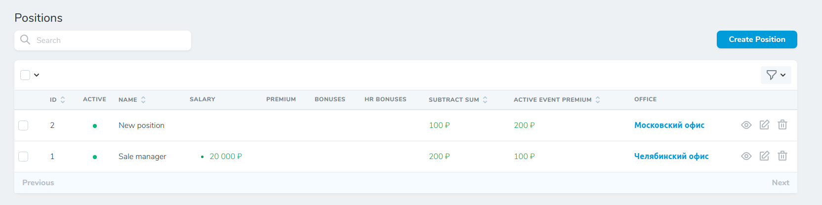 Должности в системе, необходимы для расчёта зарплат. Добавляются в систему пользователем, который имеет на это права.