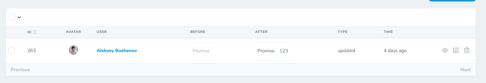 Данные в этой таблице заполняются автоматически при сохранении / редактировании / удалении / просмотре сущности или сущностей, связанных с ней. Показано кто изменил, что изменил, когда изменил и какие значения у сущности были до изменения